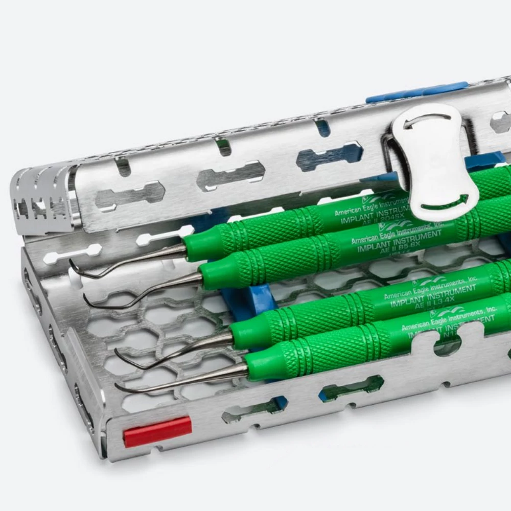Titanium Instrument Set - Consisting of AEII204SX scaler for the posterior region, AEIIB5-6X universal curette for the posterior region, AEIIL3-4X for improved access in the posterior region of the upper jaw, AEIIN128-L5X scaler/curette combination for anterior teeth. In practical metal cartridge.