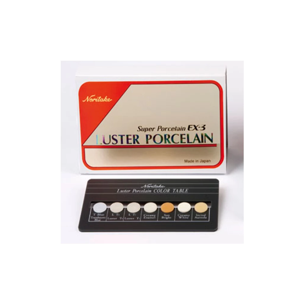 Noritake EX-3 Luster Color Table - Luster opaleszcens masszánkénti fogszínkulcs A NORITAKE SUPER PORCELAIN EX-3 feldolgozása egyszerű. Kiemelkedő tulajdonságait nagyon finom szemcseméretének köszönheti. A NORITAKE SUPER PORCELAIN EX-3 kiemelkedik a leplezőkerámiák közül, mert hőtágulási együtthatója az égetések során (CTE) is stabil marad . Nagy fesztávolságú hídak égetése során is minden tag pontosan megformázható akár több égetéssel is, a repedés minimális kockázatával. Alkalmazható nemes- és nem nemesfém ötvözetekhez is. Fluoreszcenciája ideális, az ezüst-tartalmú ötvözetek sem befolyásolják. A NORITAKE SUPER PORCELAIN EX-3 ideális választás kerámialeplezéshez.