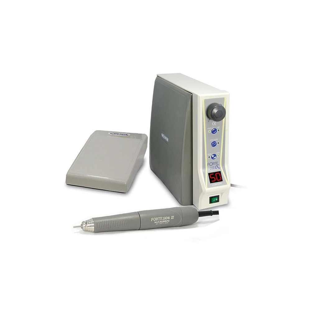 Szénkefe nélküli mikromotor beépített mikroprocesszorral, megújult kézidarabbal. Térdvezérlés. Fordulatszám: 50000 ford./perc. Nyomaték: 7,8 N/cm² Kézidarab: Forte 100 αIII