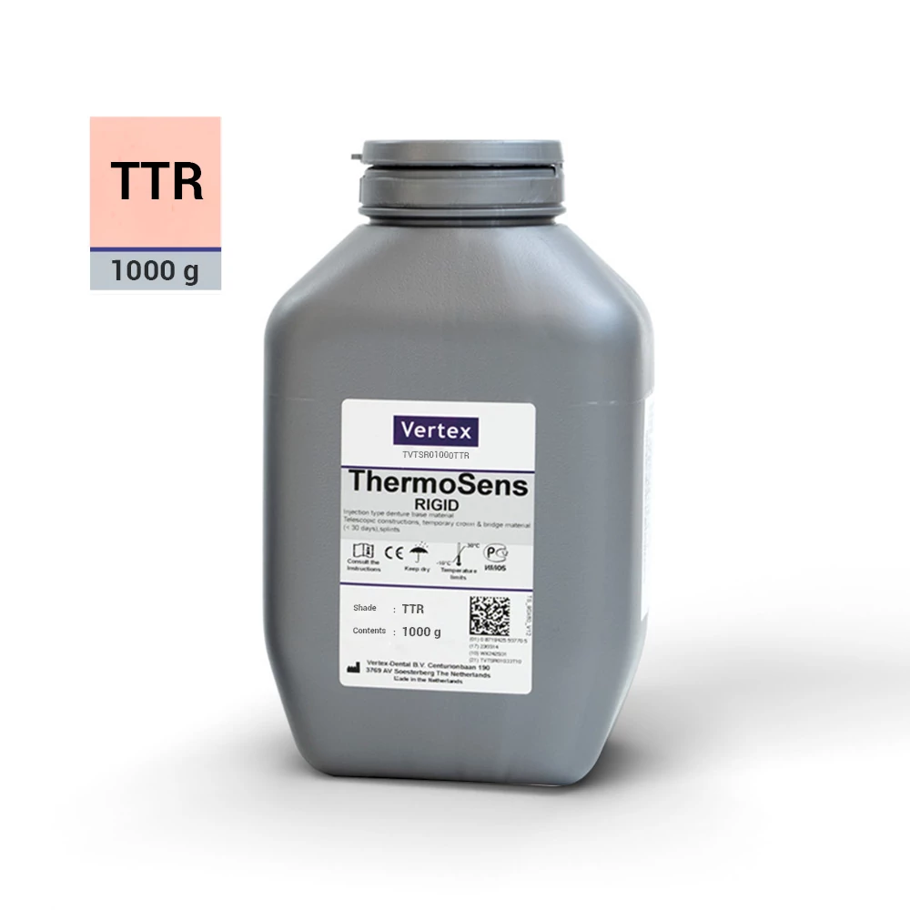 A Vertex ThermoSens egy innovatív, monomermentes, hőre lágyuló (thermoplasztikus) fogsoralapanyag, amelyet a Vertex-Dental fejlesztett ki. A TTR színű változat 1000 grammos kiszerelésben érhető el, és ideális választás teljes és részleges kivehető fogpótlásokhoz.