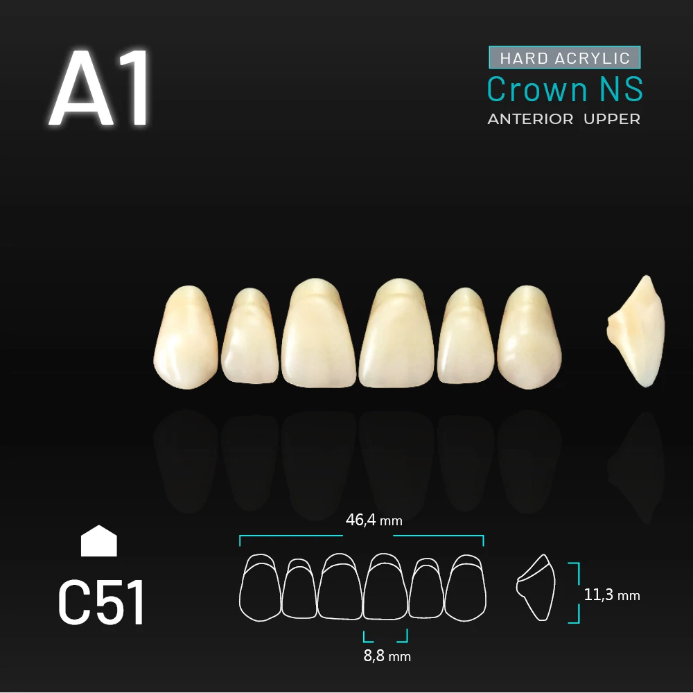 VITA color: A1. C51 upper anterior. Yamahachi COWN NS ANTERIOR is a 3D-digital reproduction of natural anterior teeth. It features solid moulds with supplementary labio-lingual width and emphasized tubercle protrusion to render space clearance provided for easy adjustments and strong clutching on the lingual gum, respectively.