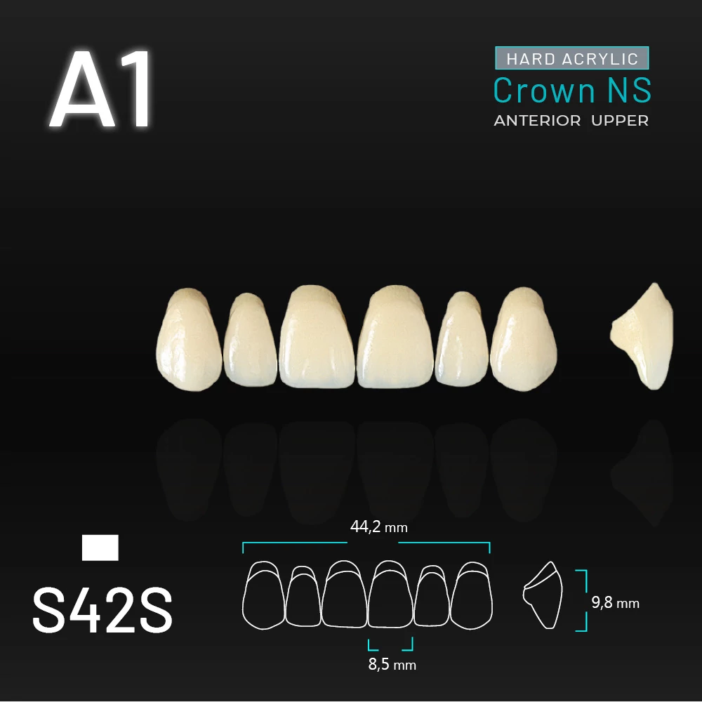 VITA color: A1. S42S upper anterior. Yamahachi COWN NS ANTERIOR is a 3D-digital reproduction of natural anterior teeth. It features solid moulds with supplementary labio-lingual width and emphasized tubercle protrusion to render space clearance provided for easy adjustments and strong clutching on the lingual gum, respectively.