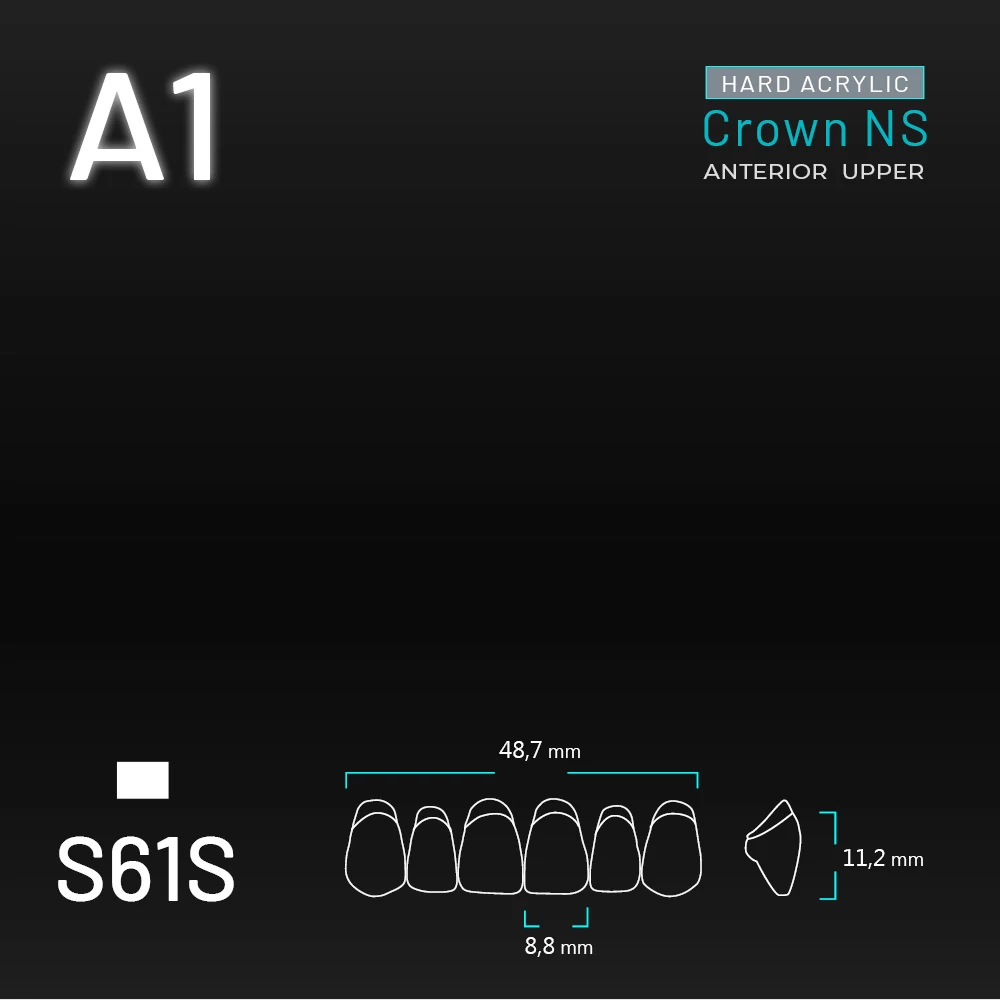 VITA color: A1. S61S upper anterior. Yamahachi COWN NS ANTERIOR is a 3D-digital reproduction of natural anterior teeth. It features solid moulds with supplementary labio-lingual width and emphasized tubercle protrusion to render space clearance provided for easy adjustments and strong clutching on the lingual gum, respectively.
