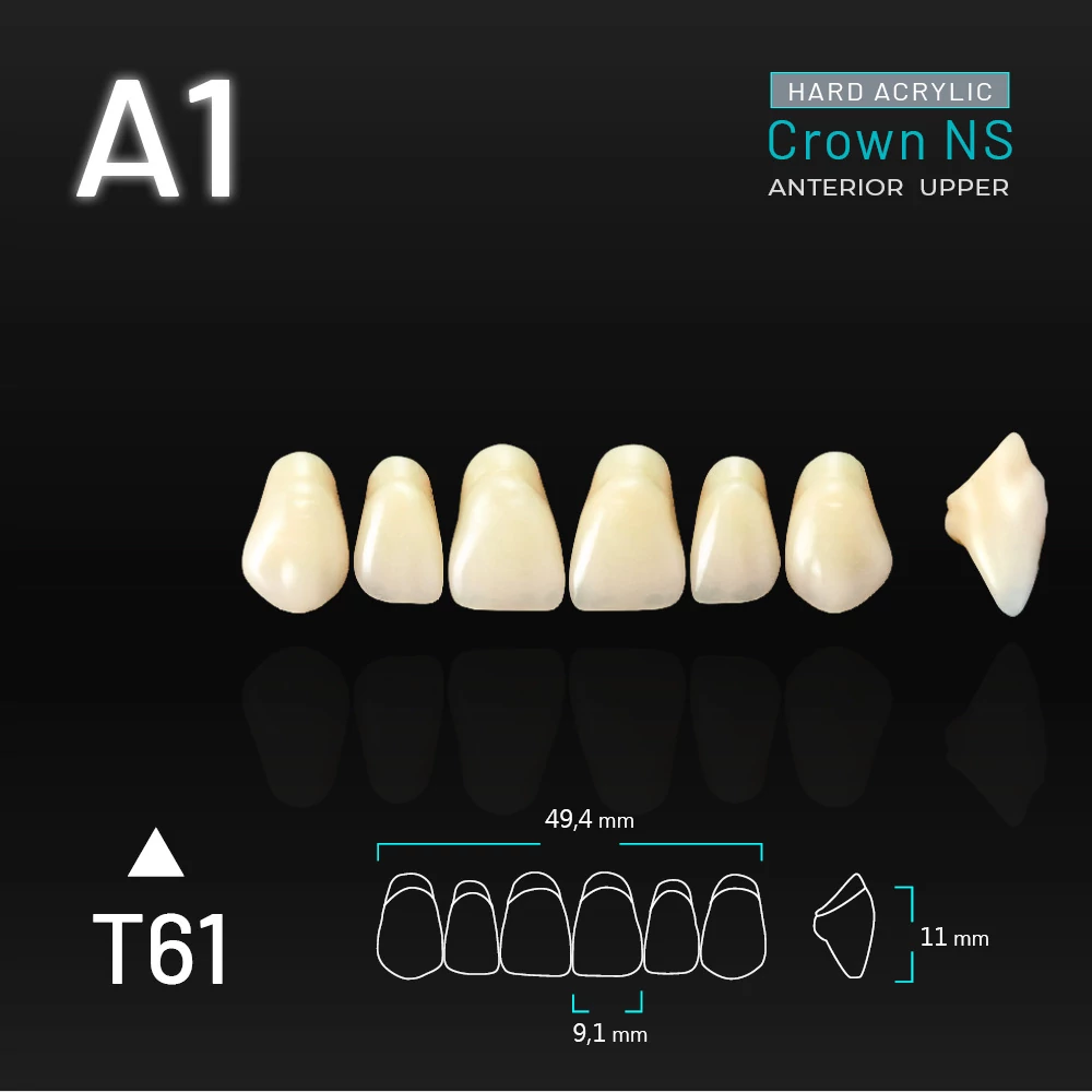 VITA color: A1. T61 upper anterior. Yamahachi COWN NS ANTERIOR is a 3D-digital reproduction of natural anterior teeth. It features solid moulds with supplementary labio-lingual width and emphasized tubercle protrusion to render space clearance provided for easy adjustments and strong clutching on the lingual gum, respectively.