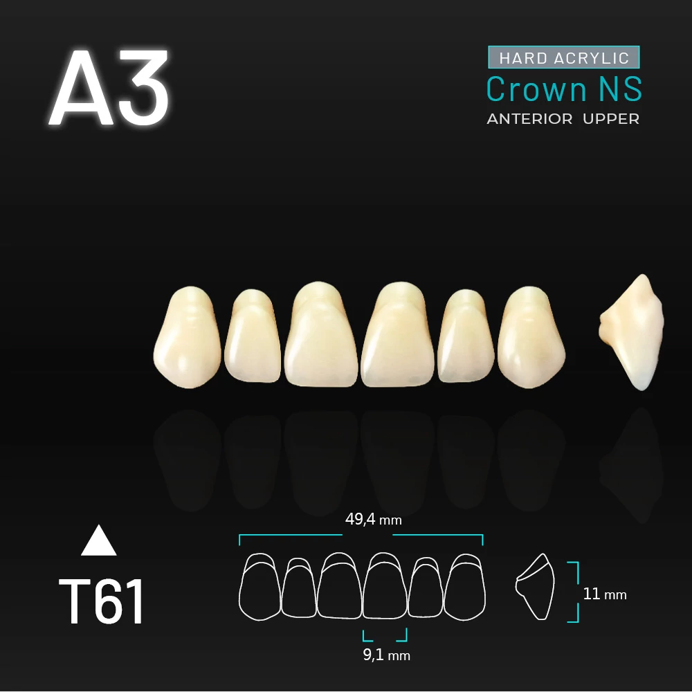 VITA color: A3. T61 upper anterior. Yamahachi COWN NS ANTERIOR is a 3D-digital reproduction of natural anterior teeth. It features solid moulds with supplementary labio-lingual width and emphasized tubercle protrusion to render space clearance provided for easy adjustments and strong clutching on the lingual gum, respectively.