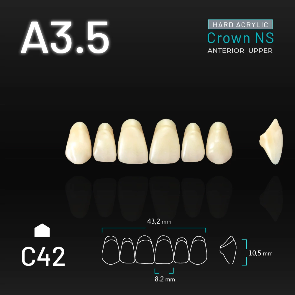 VITA color: A3,5. C42 upper anterior.Yamahachi COWN NS ANTERIOR is a 3D-digital reproduction of natural anterior teeth. It features solid moulds with supplementary labio-lingual width and emphasized tubercle protrusion to render space clearance provided for easy adjustments and strong clutching on the lingual gum, respectively.