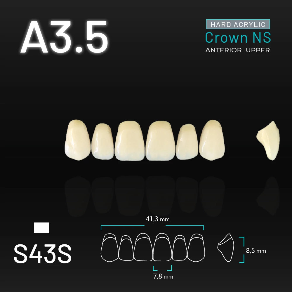 VITA color: A3,5. S43S upper anterior. Yamahachi COWN NS ANTERIOR is a 3D-digital reproduction of natural anterior teeth. It features solid moulds with supplementary labio-lingual width and emphasized tubercle protrusion to render space clearance provided for easy adjustments and strong clutching on the lingual gum, respectively.