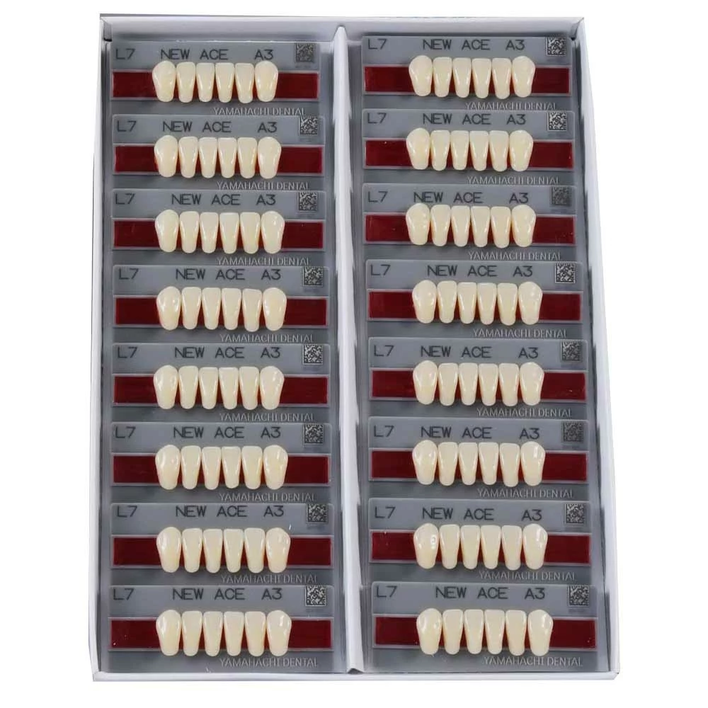 L7 lower anterior. Yamahachi 2-layer VITA A2 colored acrylic teeth for removable dentures. In full and partial denture cases, the resin teeth closely harmonize in shape and color with natural teeth and can be easily arranged, and the wax gum festooned without difficulty.