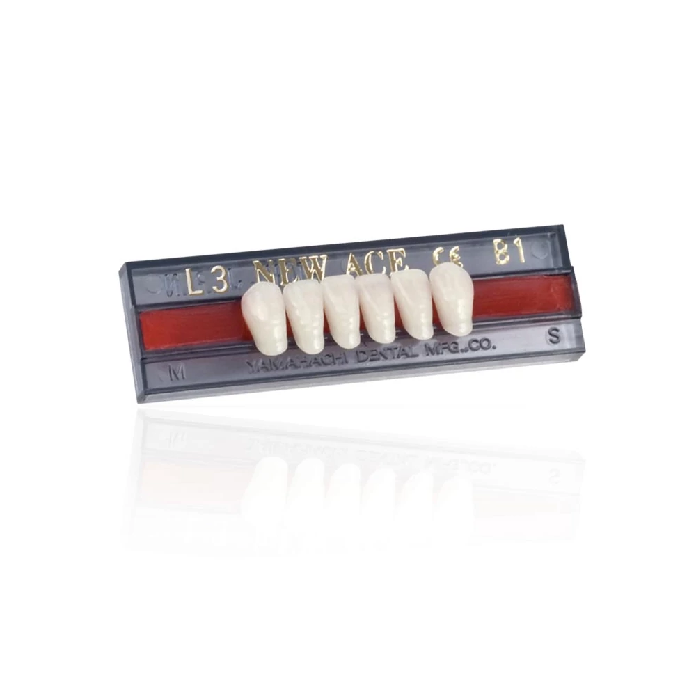 L3 lower anterior. Yamahachi 2-layer VITA B1 colored acrylic teeth for removable dentures. In full and partial denture cases, the resin teeth closely harmonize in shape and color with natural teeth and can be easily arranged, and the wax gum festooned without difficulty.