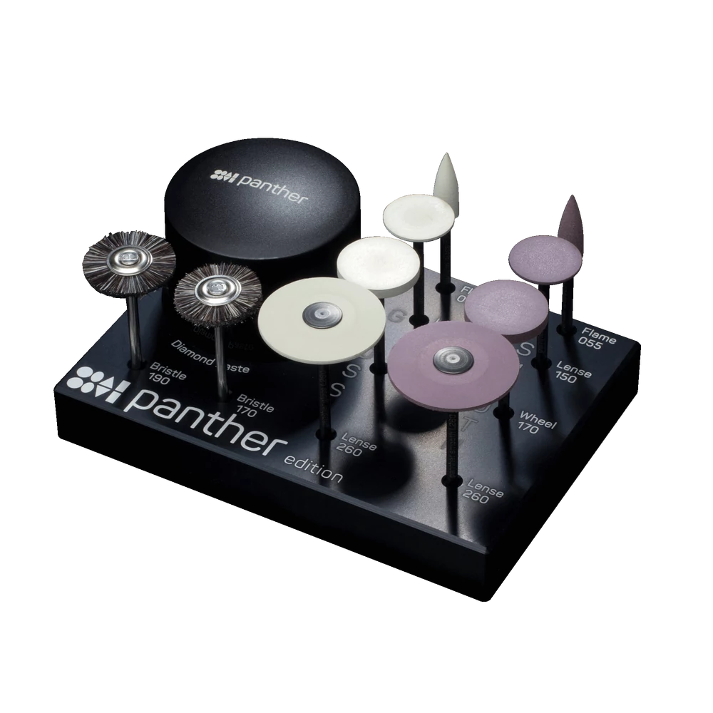 Gyémánt paszta, polírkefe 190, polírkefe 170, kidolgozó lencse 260 (fényes fehér), kidolgozó kerék 170 (fényes fehér), kidolgozó lencse 150 (fényes fehér), kidolgozó láng 055 (fényes fehér), kidolgozó lencse 260 (rózsaszín), kidolgozó kerék 170 (rózsaszín), kidolgozó lencse 150 (rózsaszín), kidolgozó láng 055 (rózsaszín).